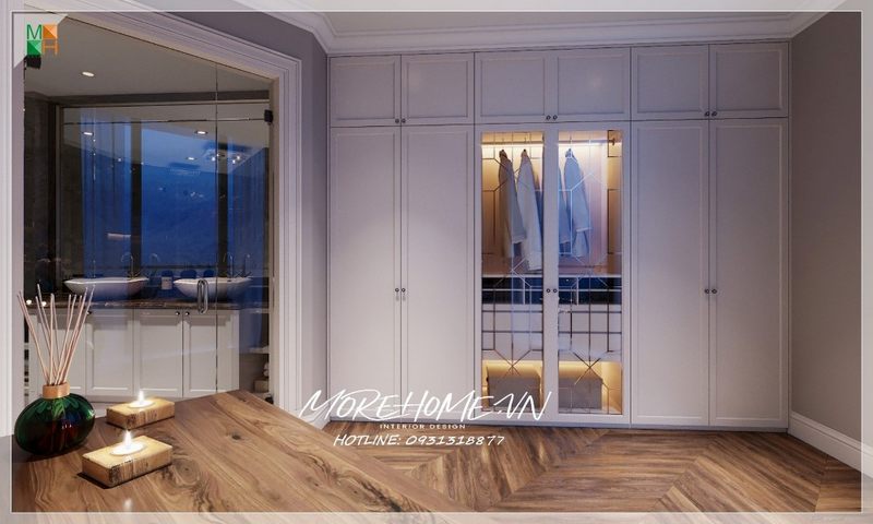 Vẻ đẹp sang trọng và độc đáo đã được tạo ra trong phong cách hiện đại của phòng ngủ vợ chồng bởi các mặt hàng nội thất gỗ như sàn gỗ, bộ bàn ghế trang điểm, tủ quần áo, kệ tivi, cửa gỗ óc chó, mặc dù các sản phẩm nội thất gỗ công nghiệp là lựa chọn phổ biến.